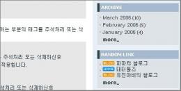 3) 적용방법은 각 사용하는 스킨중 Archive와 Link를 표시하는 부분의 태그를 주석처리 또는 삭제하신후 치환자를 적용시키면 됩니다.(skin.html)