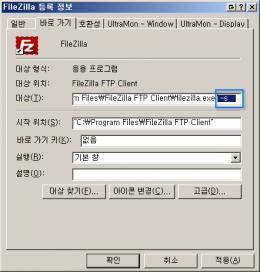 파일질라 바로가기 등록 정보의 대상항목에서 옵션 "-s"만 넣어주면 시작할 때 사이트관리자가 바로 열리게 된다. 설정 옵션에 이 항목이 있다면 사용자가 편리할 텐데 아쉬울 뿐이다. 언젠가는 넣어주리라 생각함.